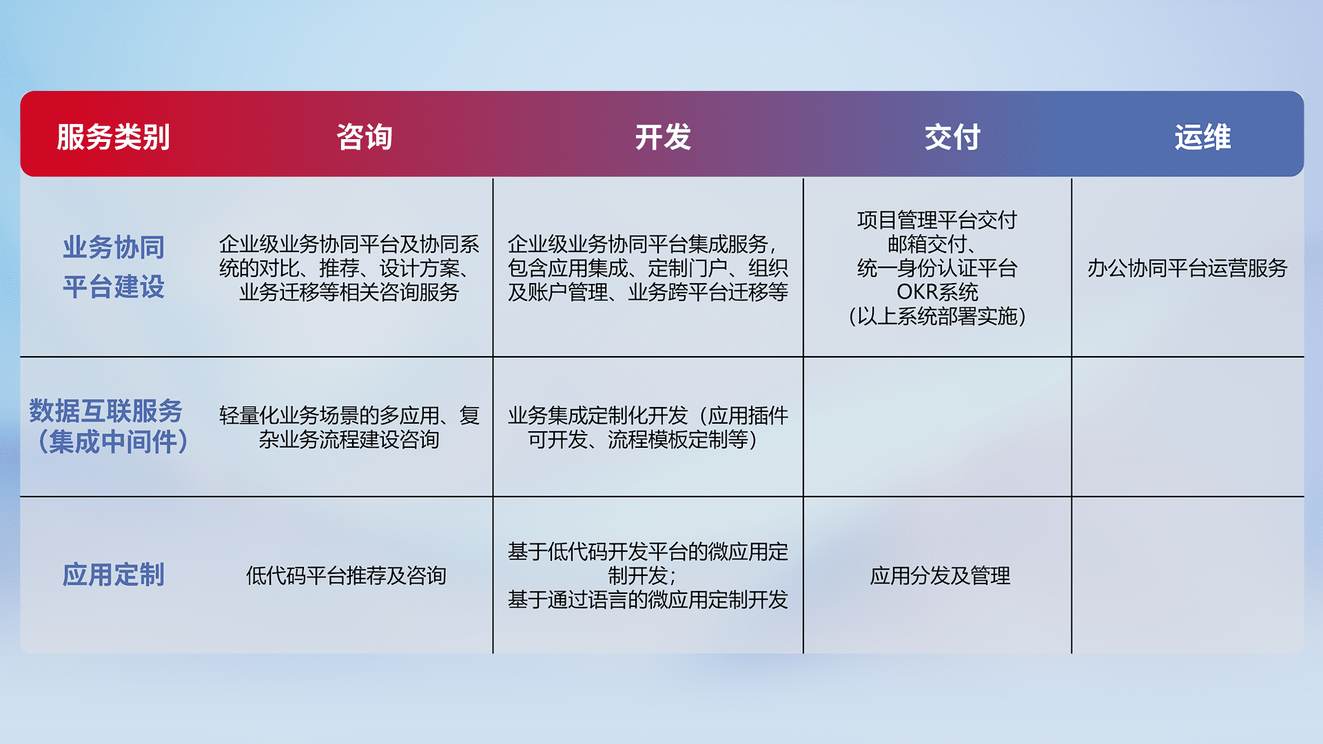 针对钉钉、、企微、、、IDaas等平台级产品提供产品的规划、、方案、、、交付、、、、定制化开发等服务,,实现如统一协同办公、、、、智能客户服务、、、、混合会议管理、、智能数据查询、、等业务场景,,,实现数字化转型。。。。