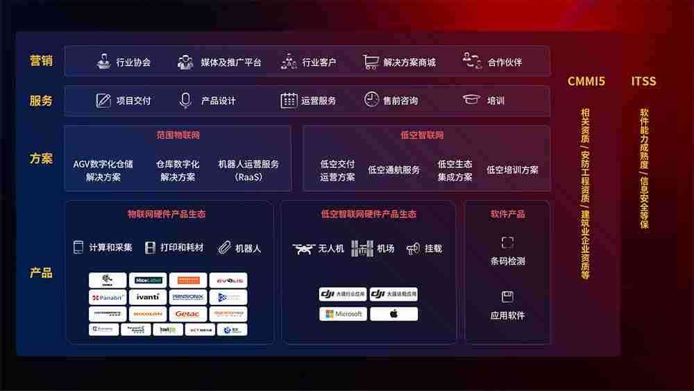 聚合国内外先进的物联网硬件产品品牌,,,聚焦数字化仓储、、、机器人运营、、低空智联网等领域,,,,共同打造适合客户业务场景的解决方案并提供交付服务